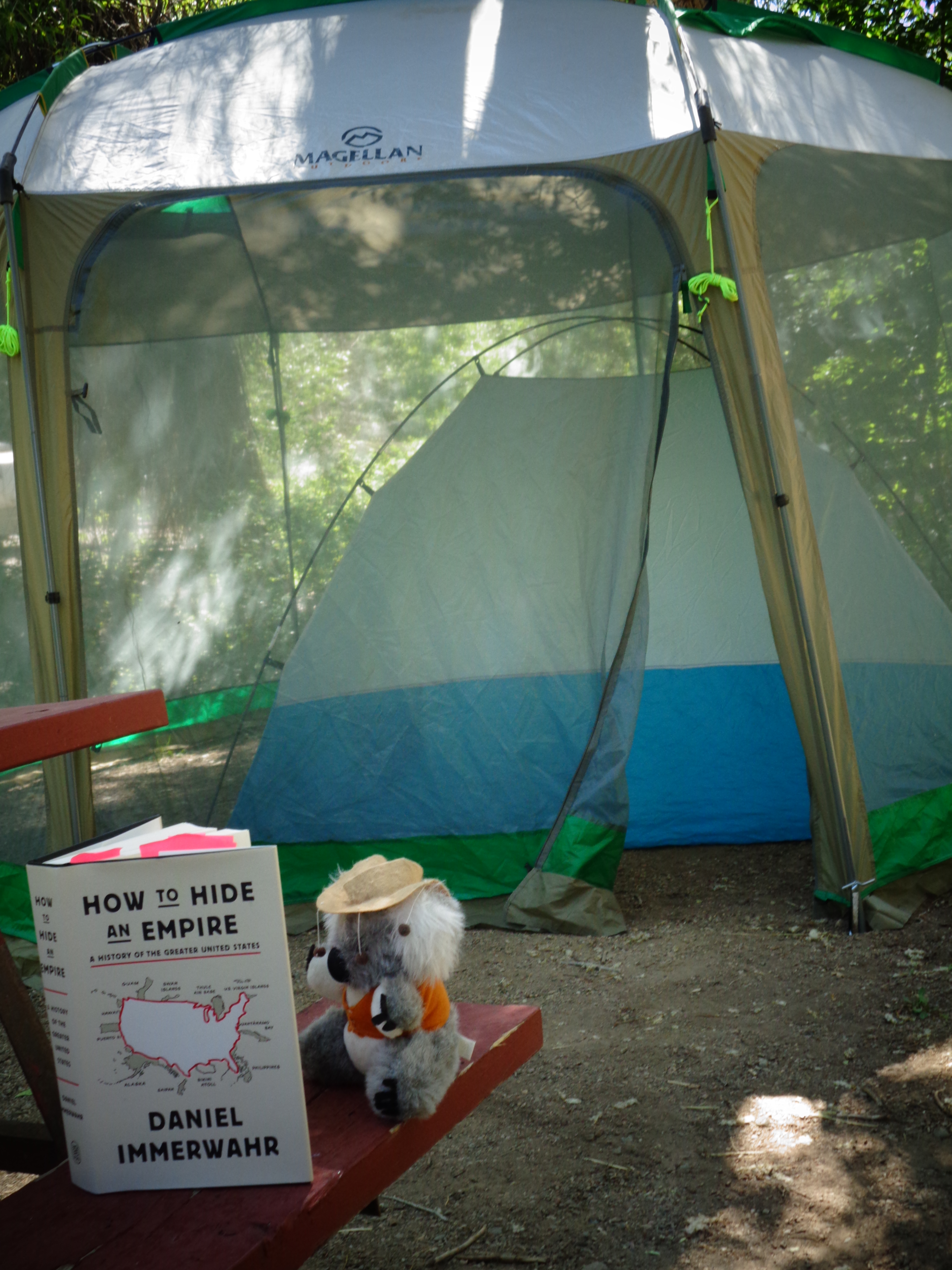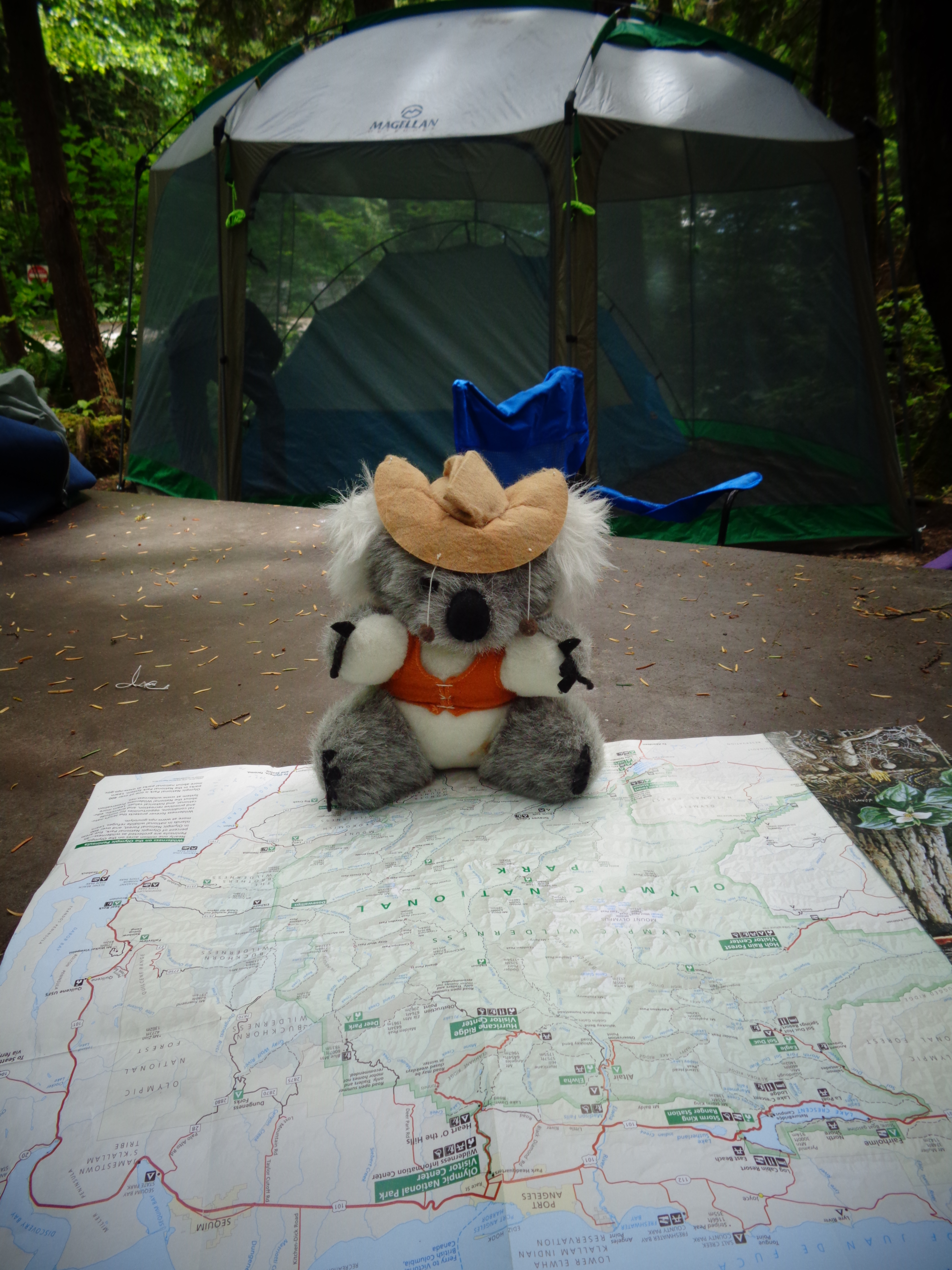 By the time we got to Olympic, A.B. was feeling more confident about Jay’s ability to set up camp. Pictured here: Adventure Bear peruses the park map. He’s heard there are salmon about!