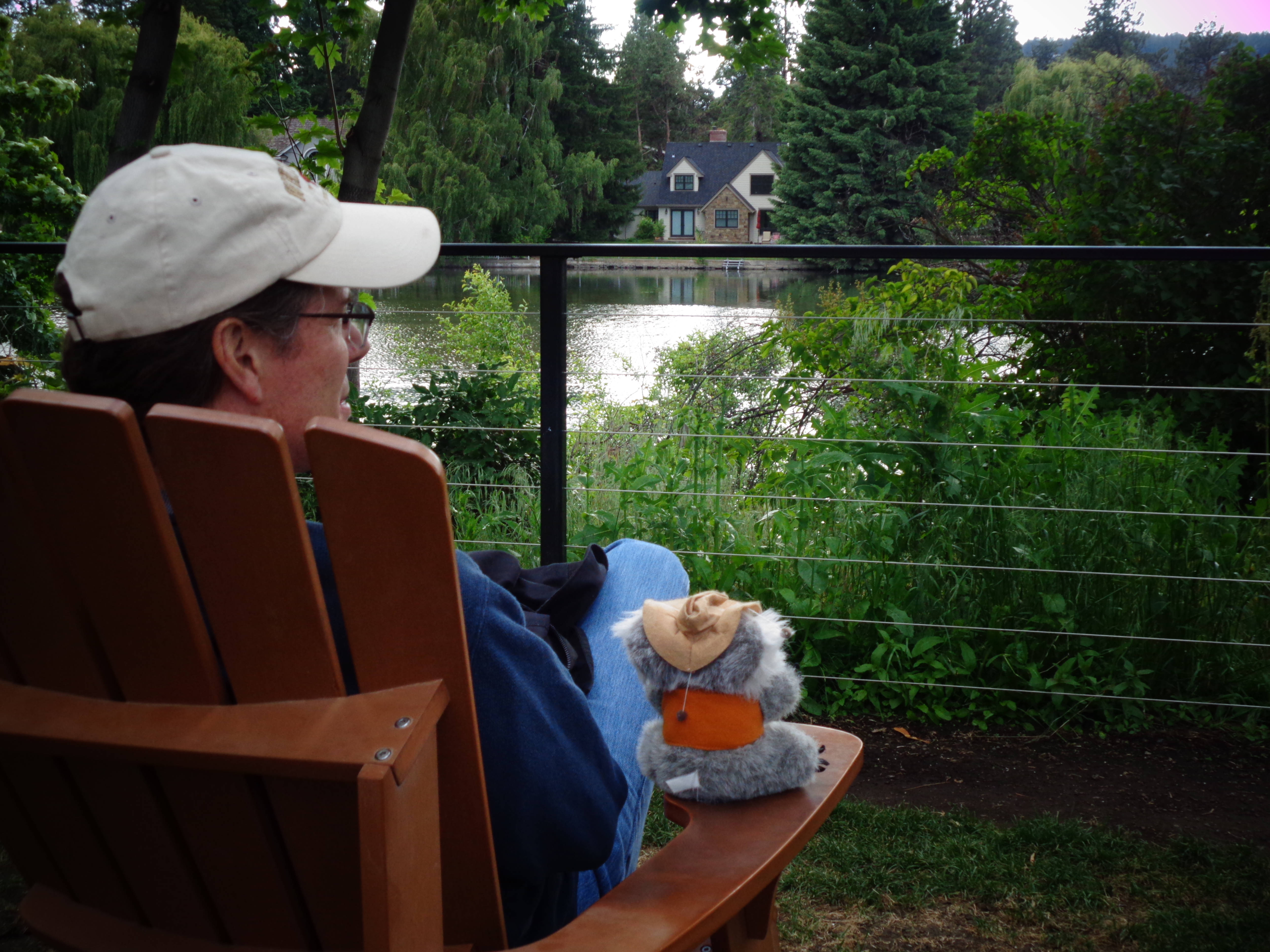 Jay and Adventure Bear enjoy some quiet time looking over the river in Bend, OR. The life of a Bear on the road can be taxing, and A.B. likes his downtime with his People.