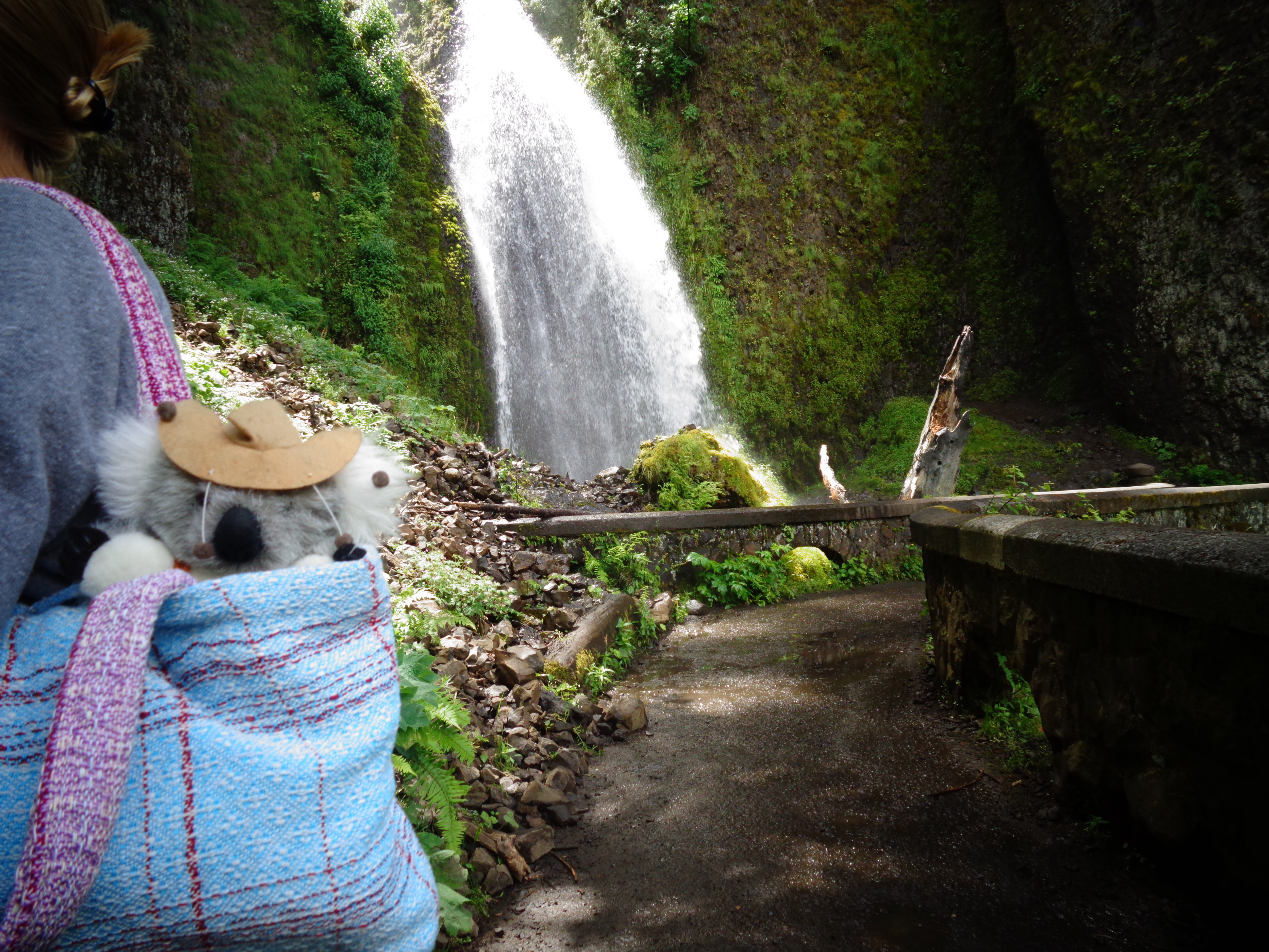 Adventure Bear in his trailer, faithful Agent by his side, waiting for the photo shoot at Wahkeena Falls.