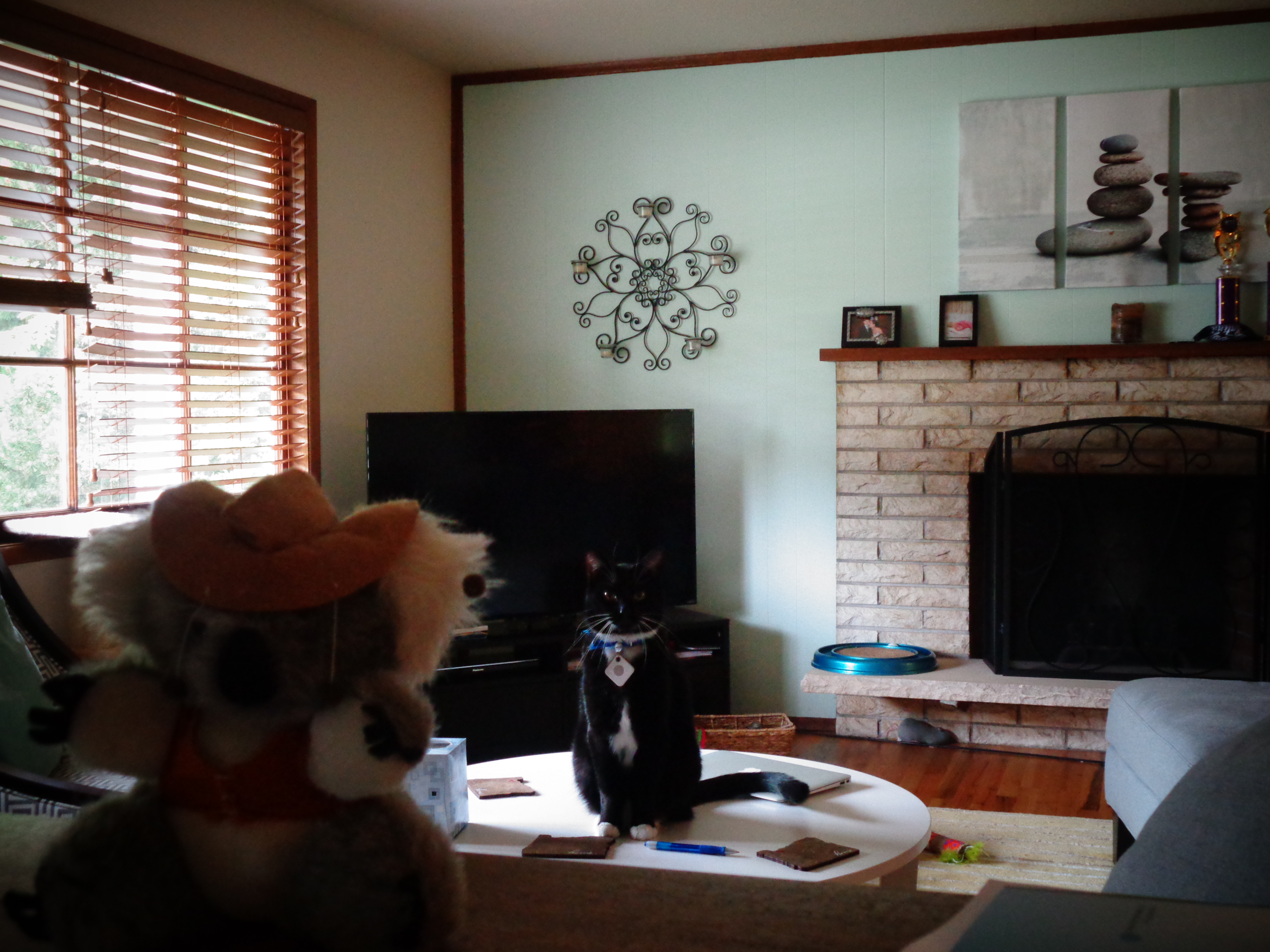 It seems clear who is on patrol in this house…Adventure Bear keeps a respectful distance from his gracious host.