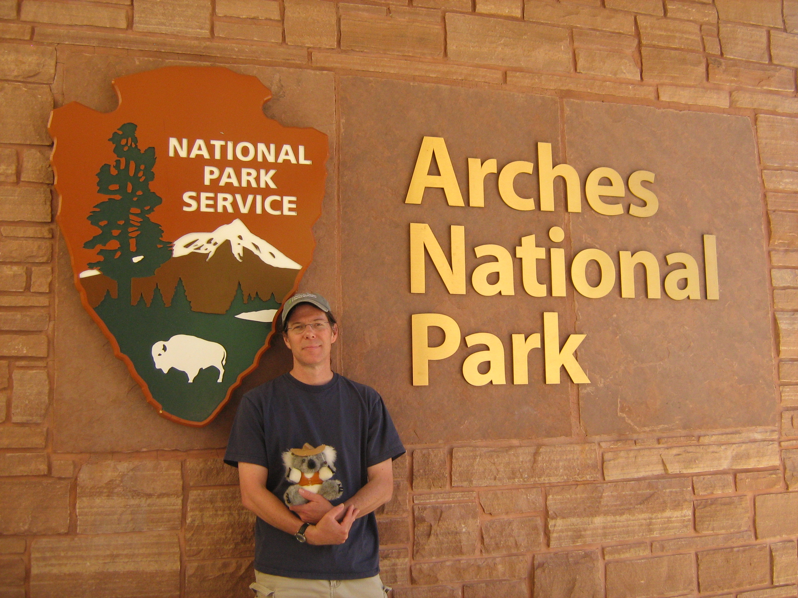 There was no need to delay arriving in Park City, UT (home of an actual bed and above freezing temperatures) in order to visit Arches National Park. In addition to the fact that you can just see interesting rock formations pretty much along the roadside around here, Adventure Bear went to Arches National Park years ago with Carrie’s parents. Pictured below is a scene from the Summer of 2016.