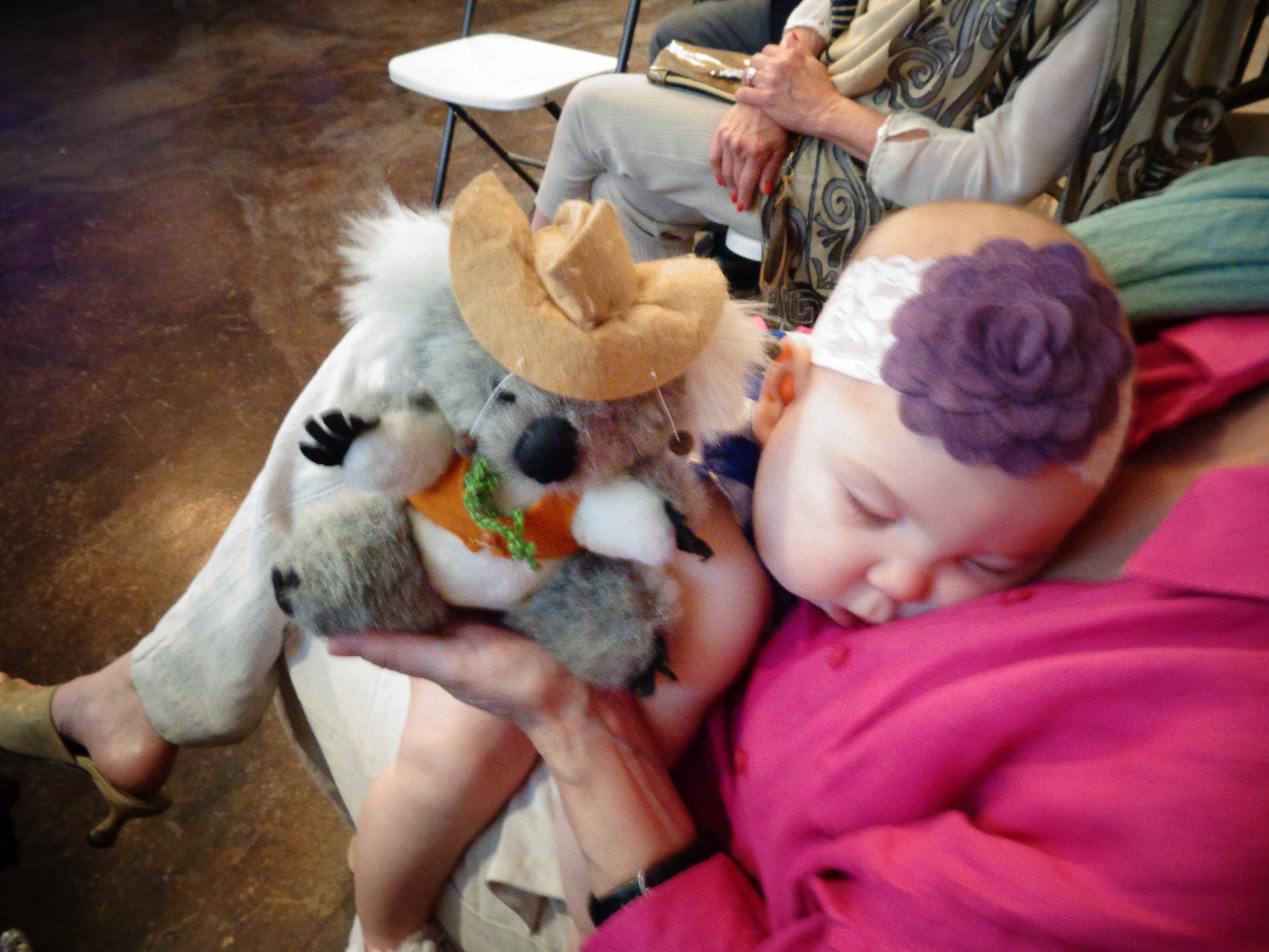 Adventure Bear and Aunt Carrie provide a little childcare for the newest of the Great Nieces. Weddings are fun, but can be tiring :).
