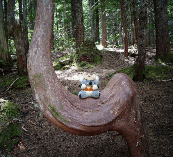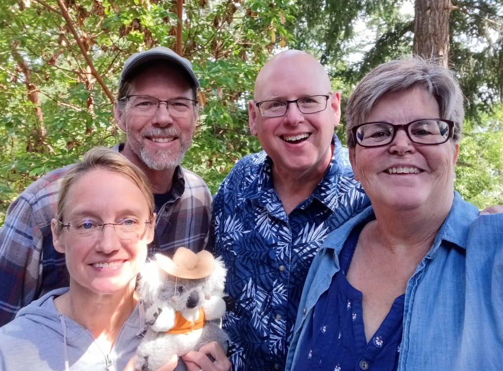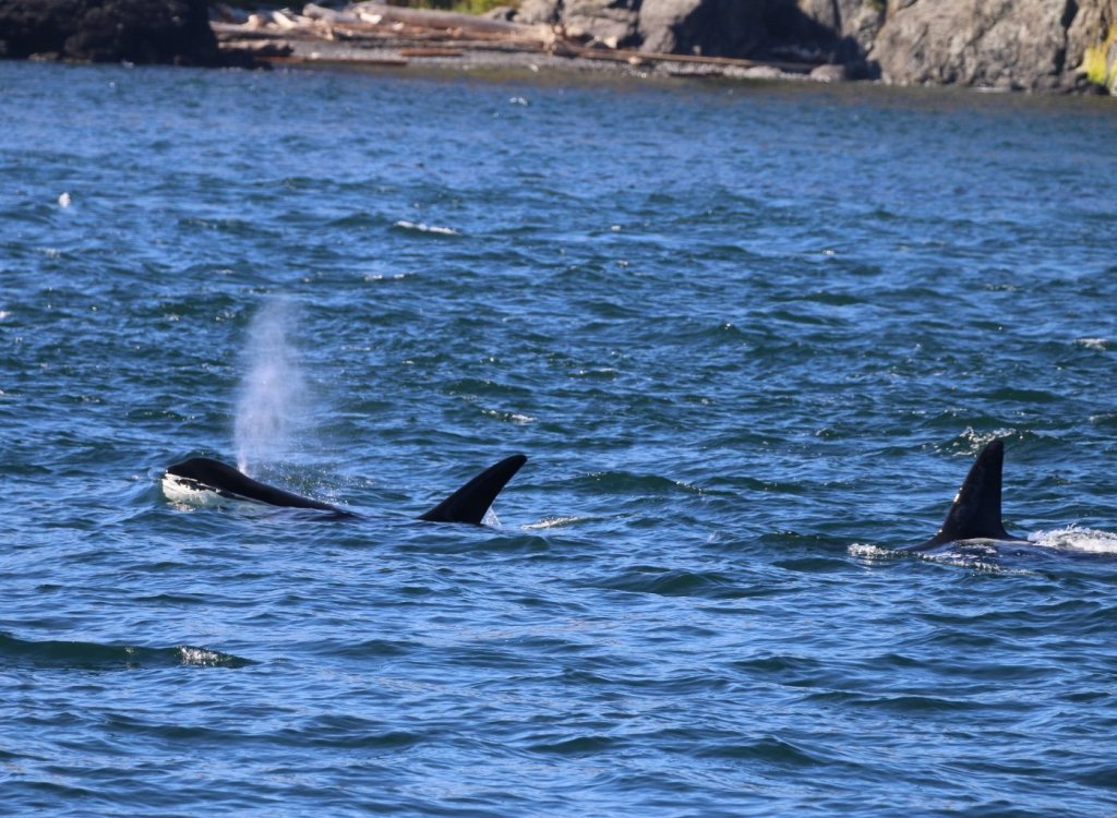 That’s what we call scenic!Look who is being a good sport and joining in the photo. Adventure Bear sets such a good example that everyone is compelled to cooperate!Two Bigg’s orcas – teenage males according to our naturalist guide – known for dining primarily on mammals rather than fish.On the whale watching trip with Mark and Leslie. Not pictured? A.B. Small mammals and Biggs orcas seem like a bad combo…