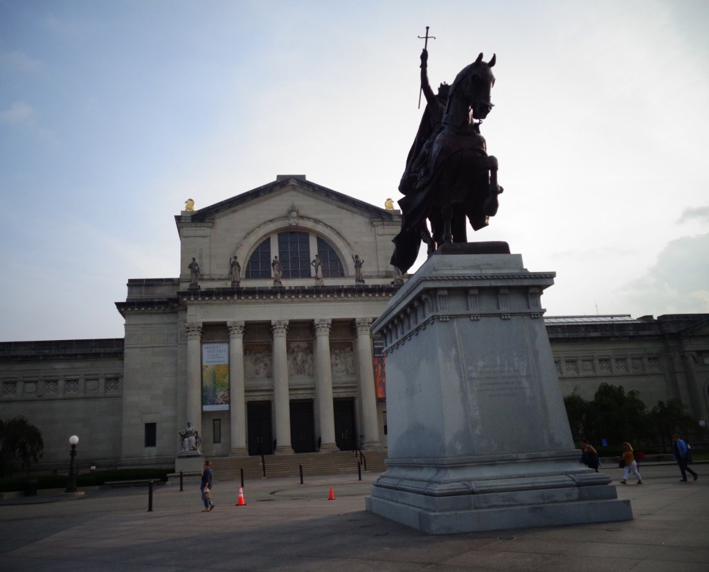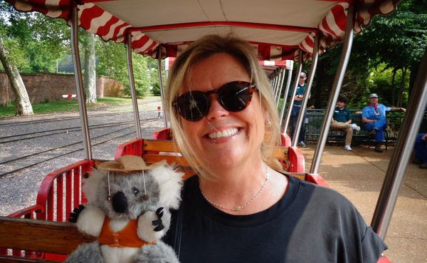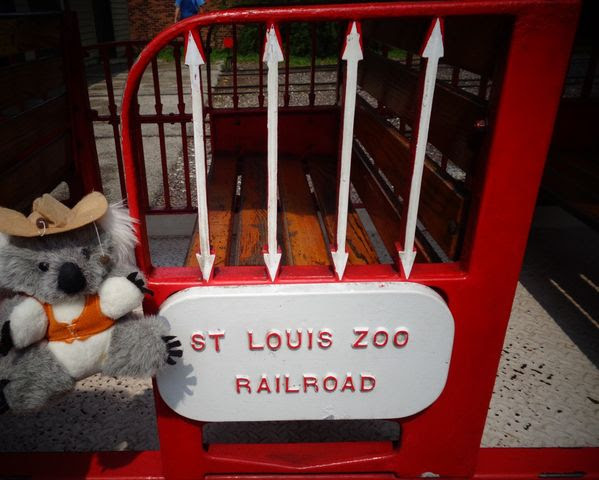 If we are anywhere near St. Louis, we make sure to visit Carrie’s cousin, Nancy Hackler Goldstein, and her marvelous family. Nancy has the coolest new job, ever. She drives the train at the St. Louis Zoo! Here she is, showing Adventure Bear the ropes. The zoo is in Forest Park, home of the 1904 World’s Fair. It’s a beautiful place, with museums, gardens and other wonders.