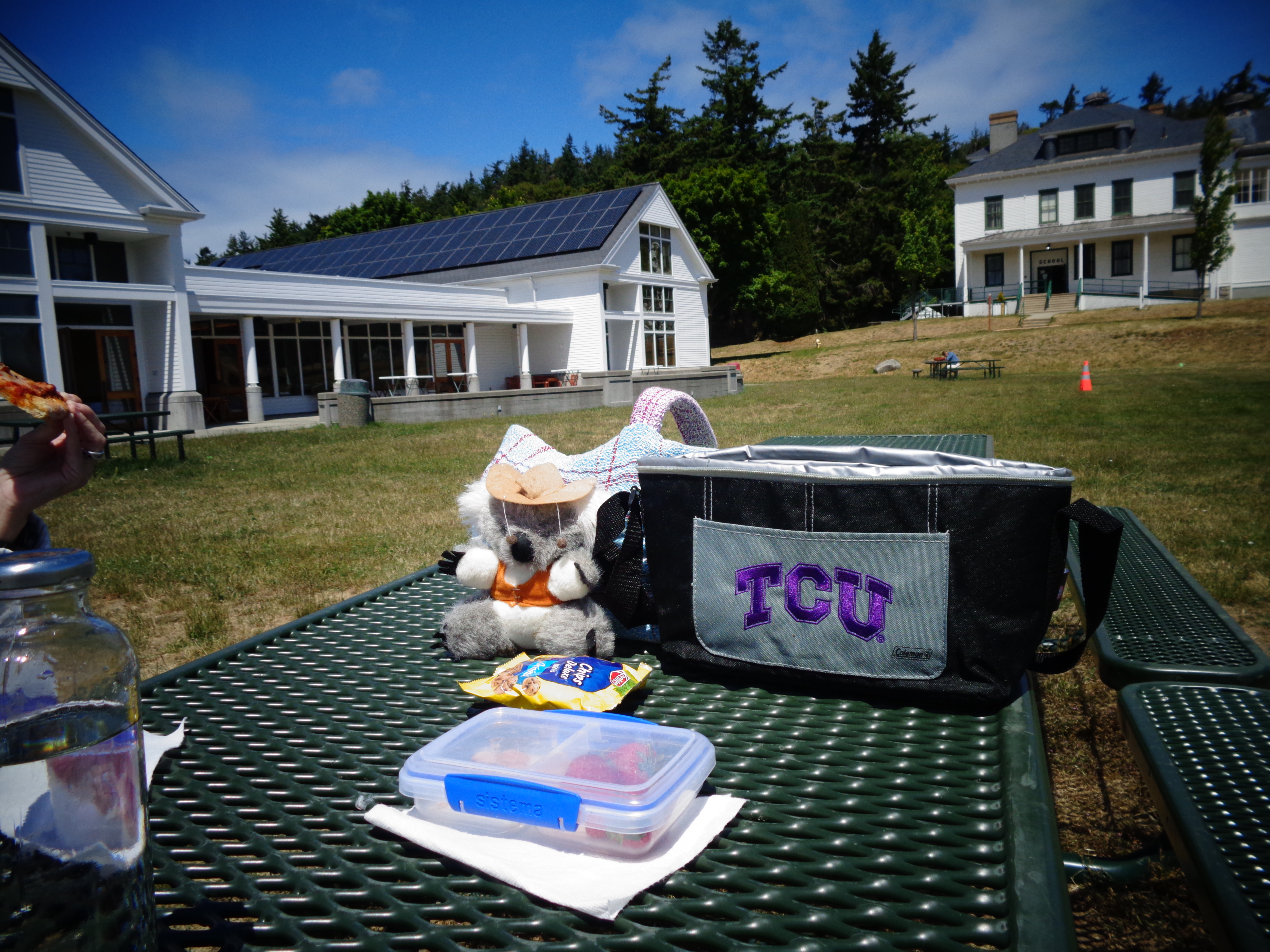 Adventure Bear enjoys a picnic lunch at Fort Worden, a state park just out of town.